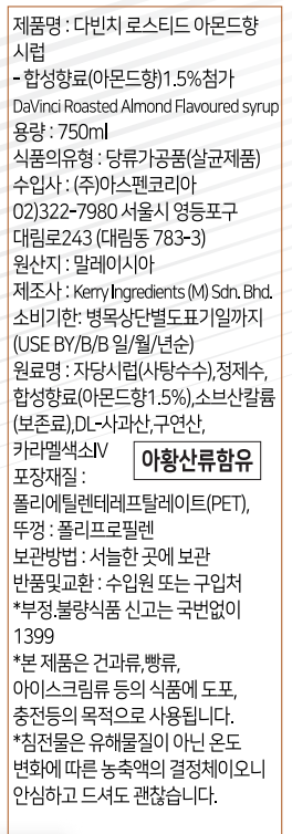 고품질의 아몬드를 직접 로스팅하여 고소함과 달콤함을 모두 살린 프리미엄 아몬드 시럽입니다.