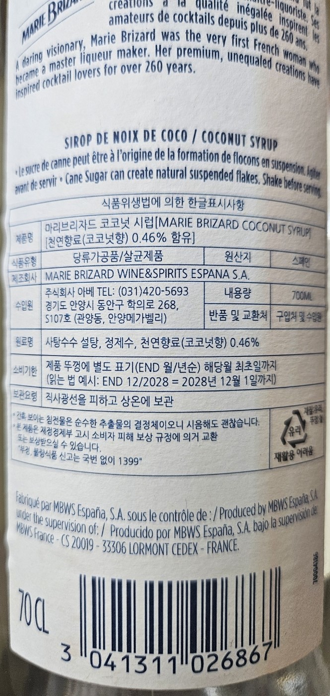 (마리브리자드)코코넛시럽_700ml*6ea/box