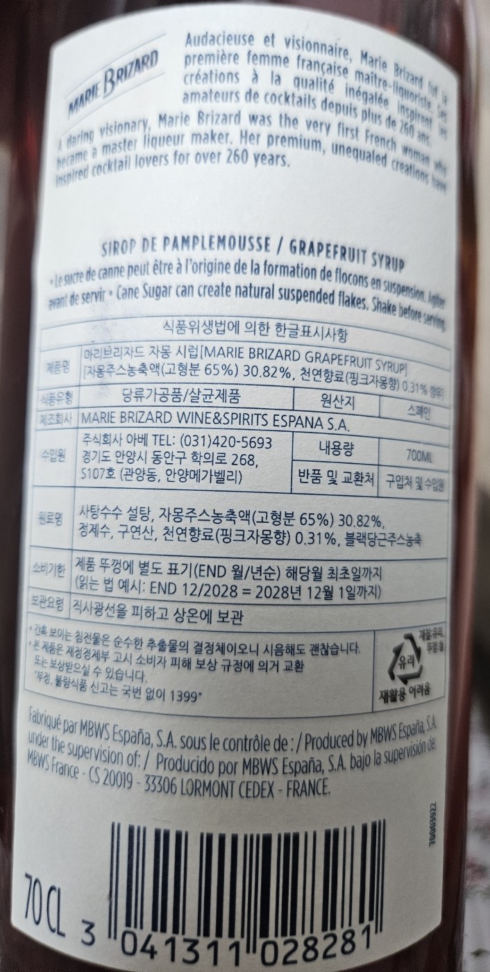 (마리브리자드)자몽시럽_700ml*6ea/box