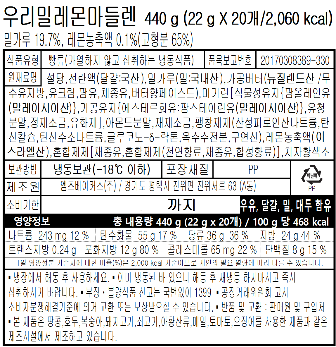 국산 밀을 사용하여 몸에 좋고 건강에 좋으며, 레몬필이 듬뿍 들어가 레몬향이 물씬 풍기는 마들렌