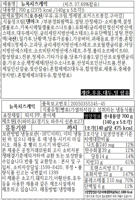 (파미유)뉴욕치즈케익_145g*5ea*18pk/box