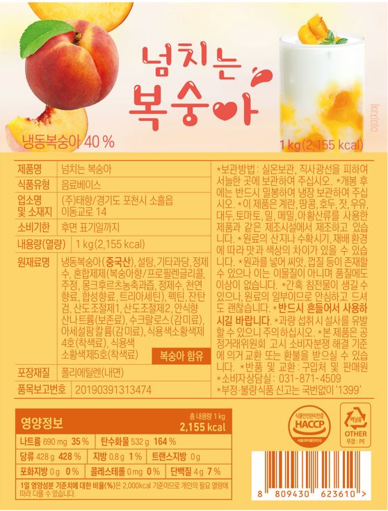 넘치는 복숭아는 단맛 만큼이나 감칠맛이 좋아 물과 우유 외에도 요거트나 티 베이스 등 다양한 종류의 음료와 접목이 가능한 베이스입니다.