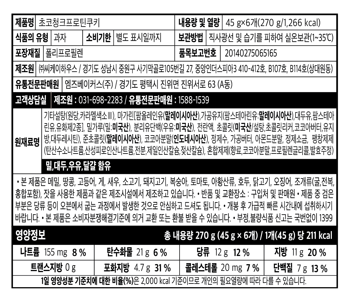 S(베이커스)초코청크프로틴쿠키_(45g*6ea)*12pk/box