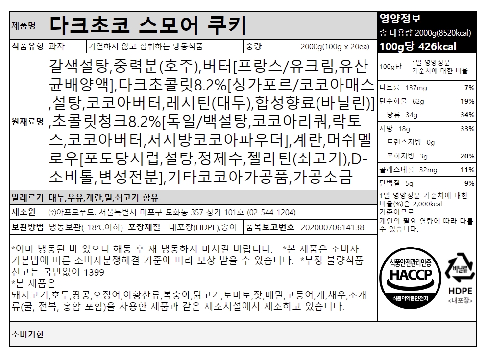S(아프로푸드)다크초코_스모어_쿠키_100g*20ea/box