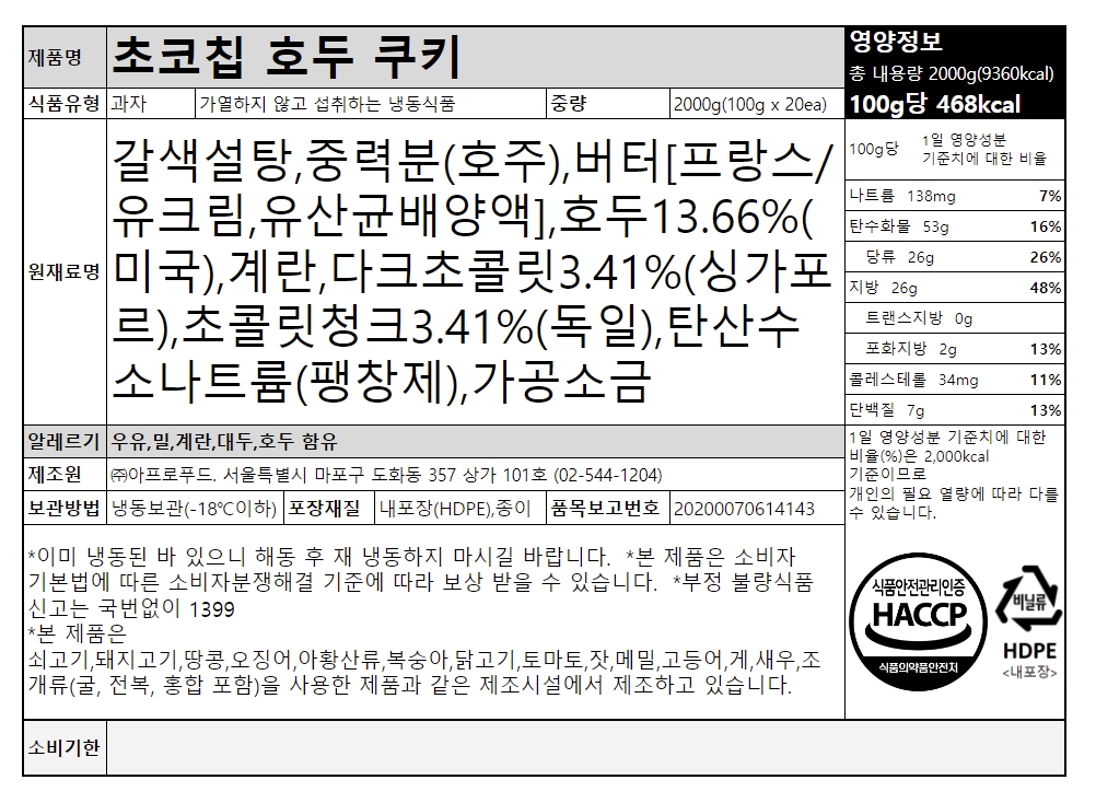 S(아프로푸드)초코칩_호두_쿠키_100g*20ea/box