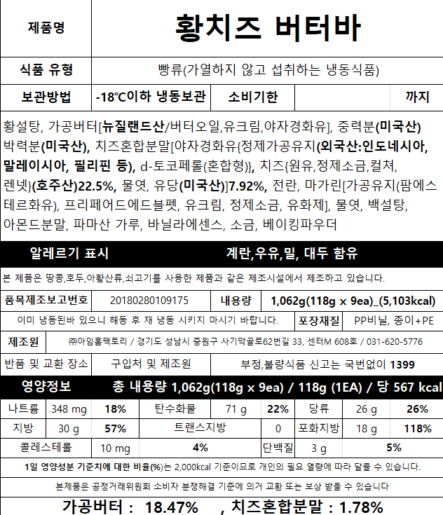 황치즈버터바(아임홈팩토리)_(118g*9ea)*16pk/box