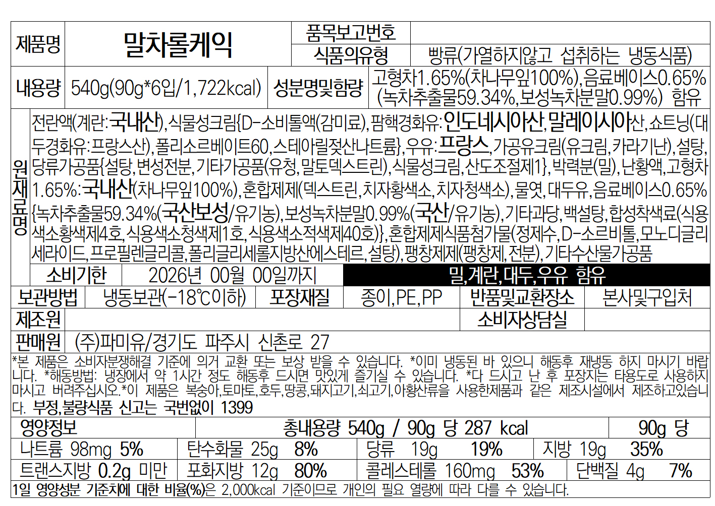 파미유_말차 롤케익(90g*6개입*18pk/BOX)