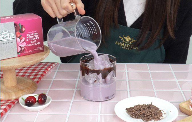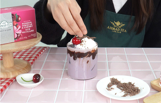 생크림 60g과 설탕 6g을 휘핑한 뒤 음료 위에 올리고 체리와 다크블라썸 초콜릿으로 마무리한다.