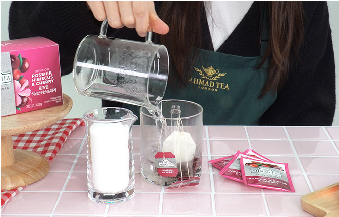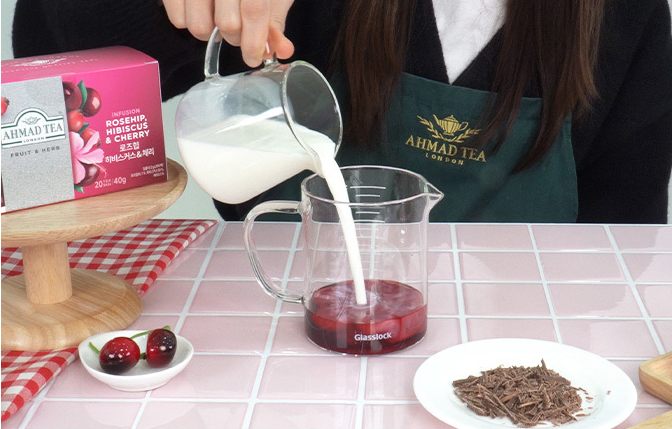 계량컵에 로즈힙 히비스커스&체리 티 시럽(1-2번) 50g과 우유 150g을 붓고 잘 섞어준다.